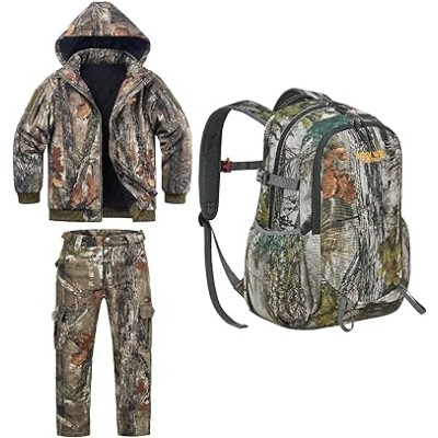 Kids Camo Hunting Clothes Silent-Jacket & Pants for Boys & Girls (M),30L Camo Hunting Bag for Kids & Youth