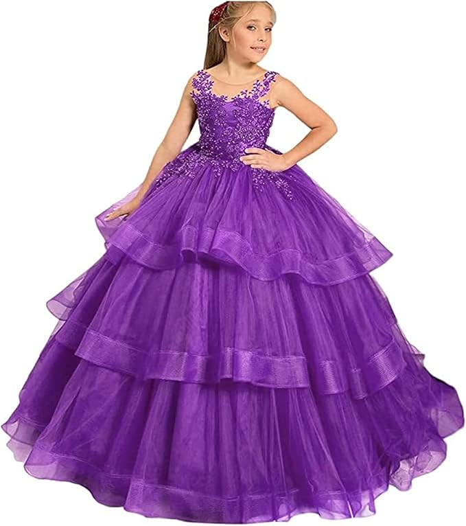Flower Girl's Sleeveless Tulle Applique Princess dress Ball Gown Layered hem Kids Wedding Party Dress