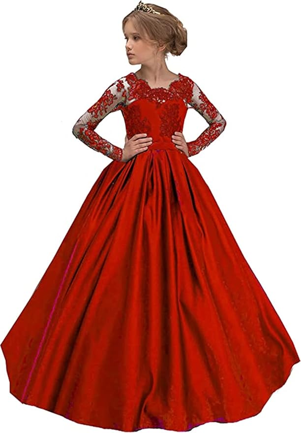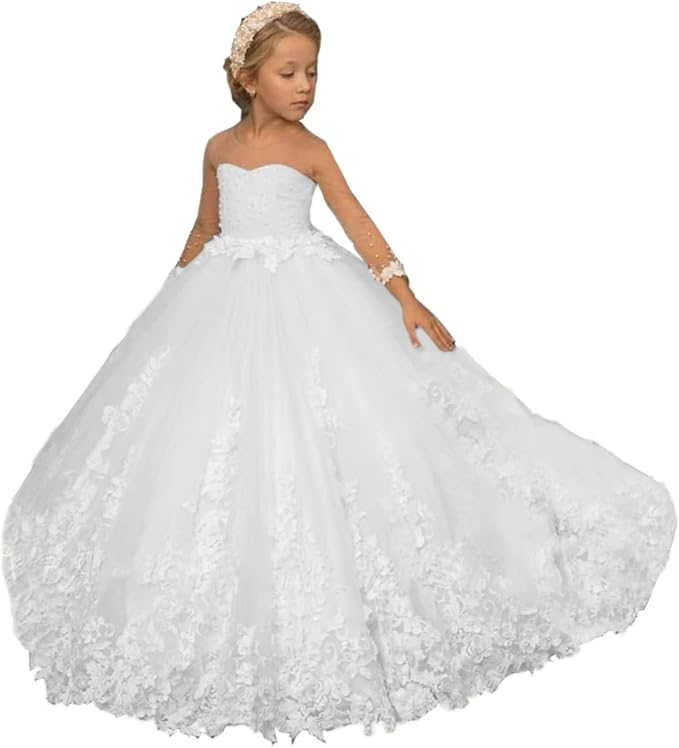 Flower Girl Long Sleeve Princess Dress Lace Applique Ball Gown for Kids A-line Formal Prom Dresses