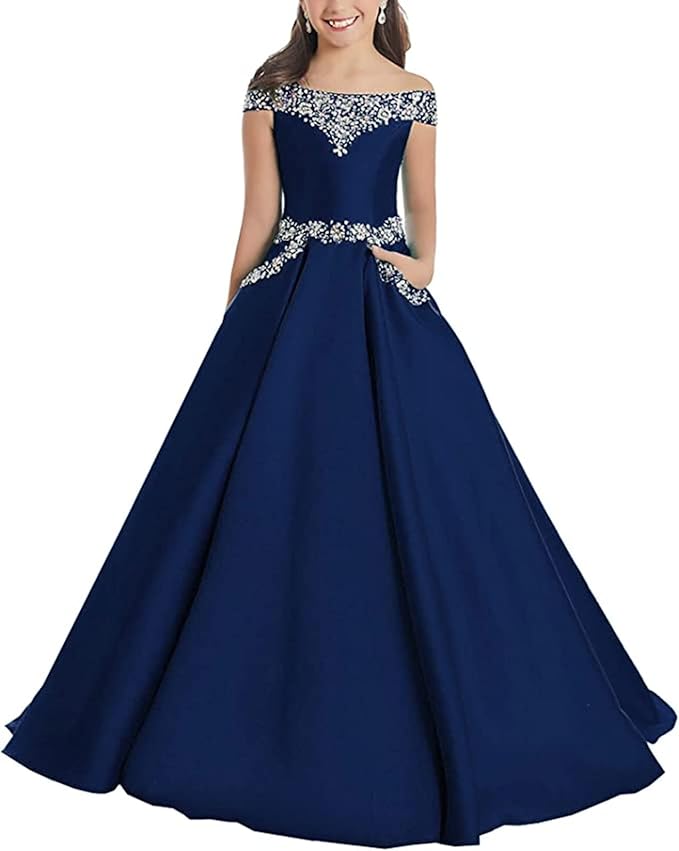 Flower Girl Off The Shoulder Beaded Ball Gown Princess Dresses A Line Pageant Dresses Long Party Dresses with Pockets