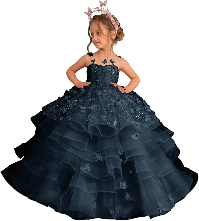 Tulle Flower Girl Dress Ruffles - Sparkly Princess Pageant Dress 3D Butterfly Appliques Girls Ball Gown