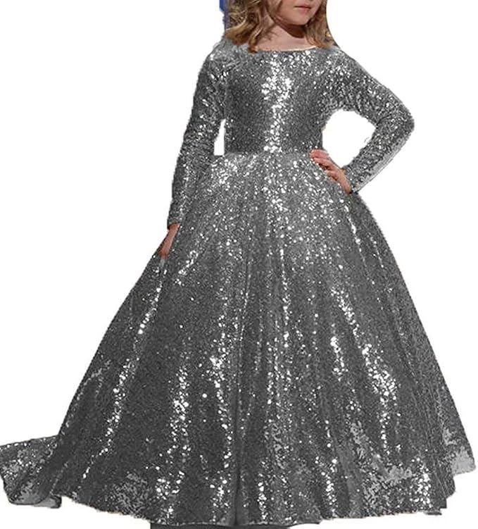 Flower Girl Dress Sequined Pageant Ball Gown Kids Long Sleeves Christmas Birthday Party Dresses