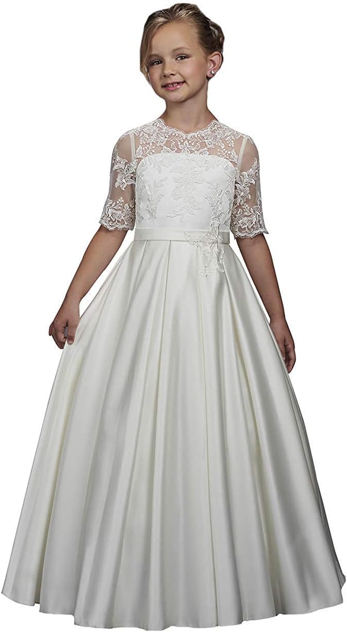 White Communion Dress for Girls 7-16 Half Sleeves Sheer Neck Lace Flower Girl Dress Satin