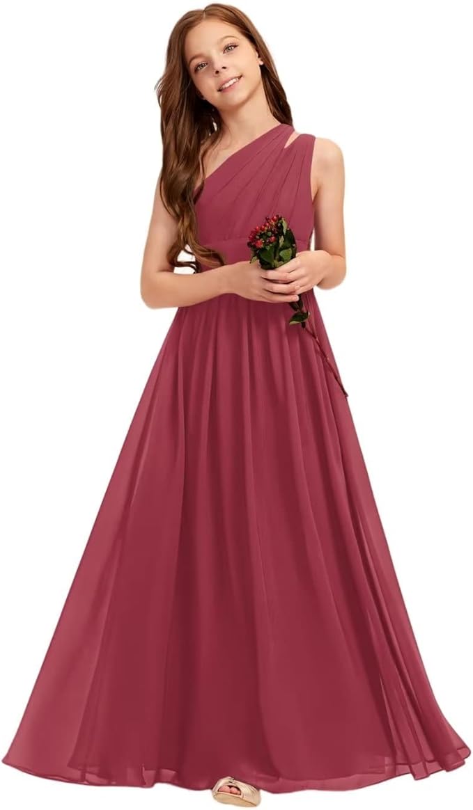A-line One Shoulder Floor-Length Chiffon Junior Bridesmaid Dress for Wedding Teen Girls Party Gowns