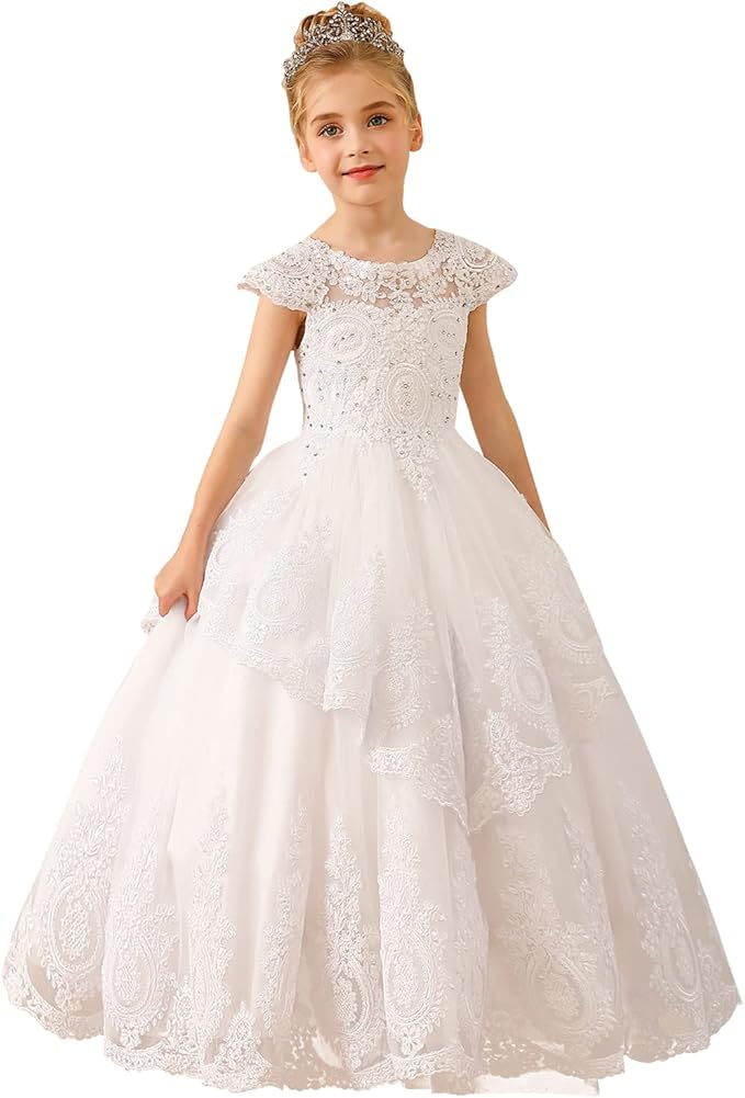 Beaded Lace Appliques Flower Girl Dress First Communion Ball Gown Kids Pageant Prom Dresses