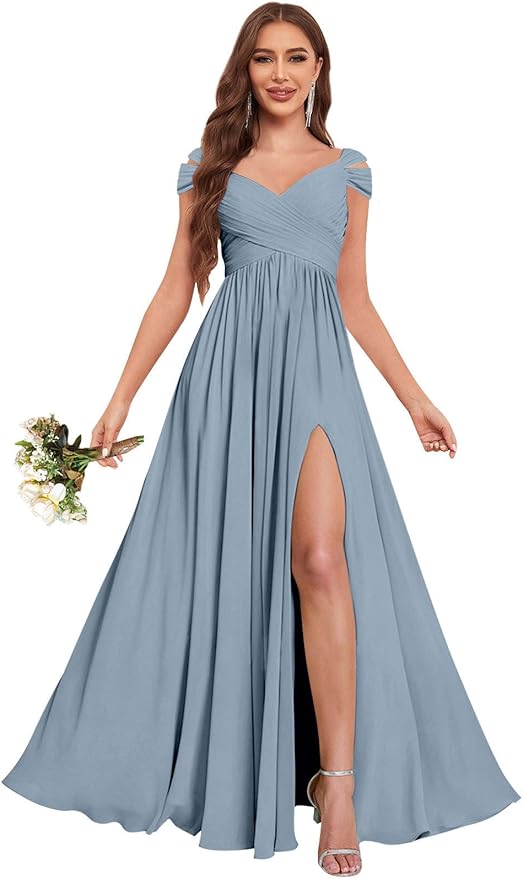 Women's Off The Shoulder Bridesmaid Dresses with Pockets Slit Chiffon Pleated Long Formal Evening Dresses