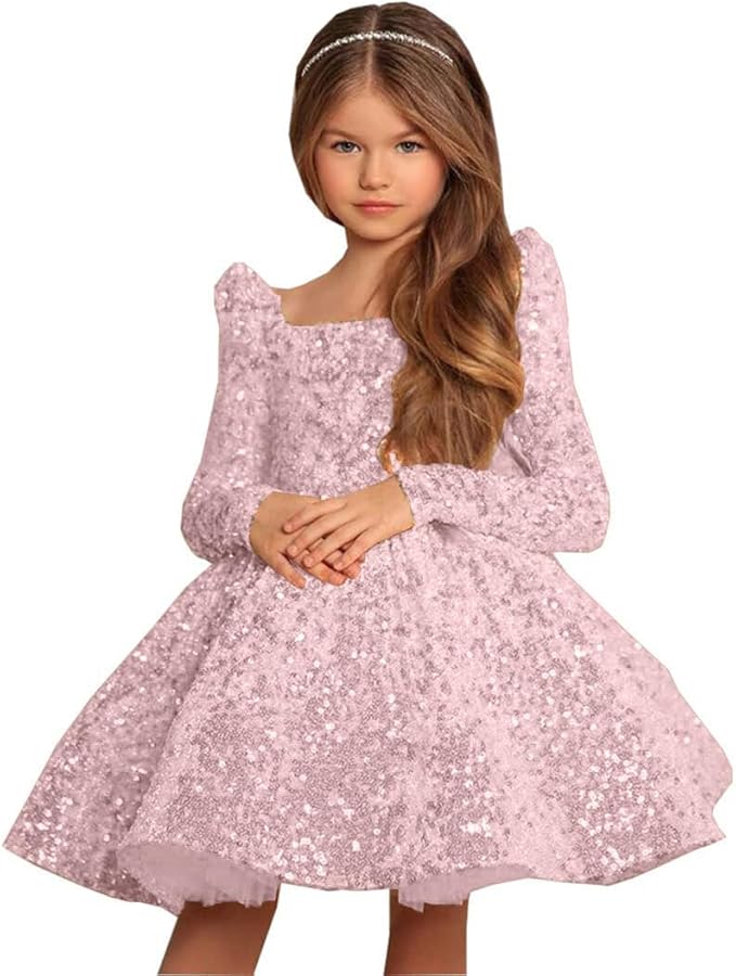 Sequin Pageant Dresses for Girls Long Sleeve Flower Girl Dress Short First Communion Dress with Bow Knot
