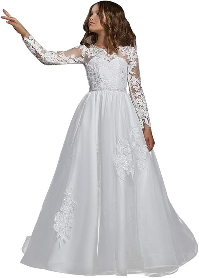 HEVECI White Holy Communion Dresses for Girls Long Sleeves Flower Girl Dress for Wedding