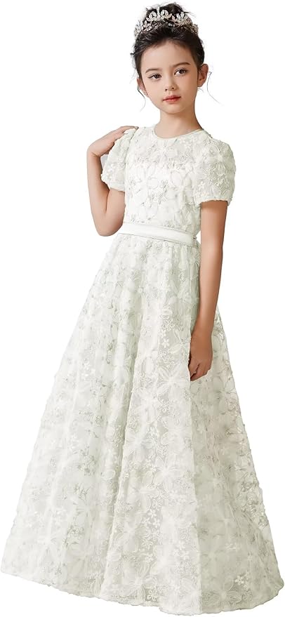 Girls Dress A-Line 3D Embroidery Tulle Flower Appliqued Satin Bow Tie Belt High-Waisted Elegant Full Length Dress