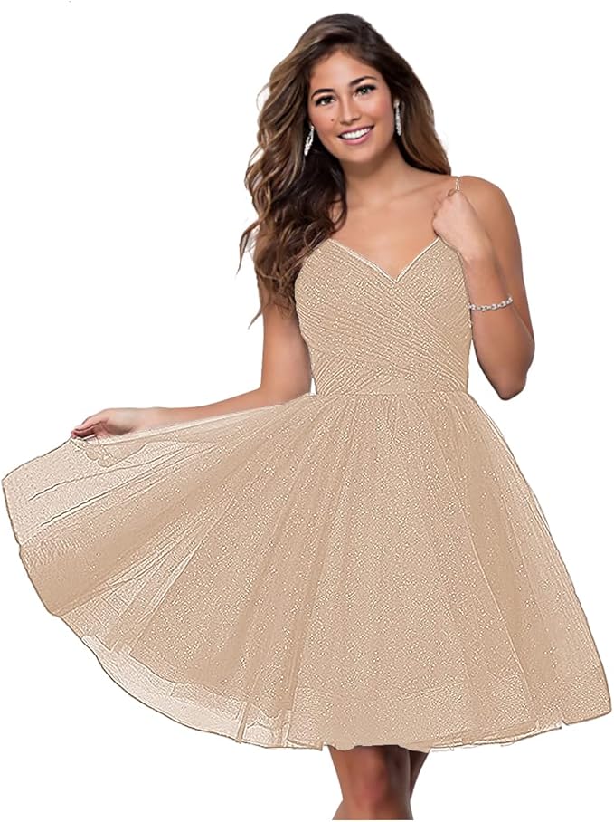 Short V-Neck Tulle Homecoming Dresses Sparkly for Teens Spaghetti Straps Cocktail Dresses WD039