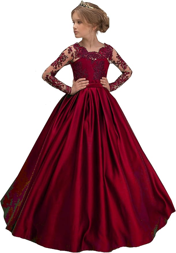 Girls' Long Sleeves Pageant Dresses Lace Aline Princess Prom Dress Formal Ball Gowns with Pockets TF006