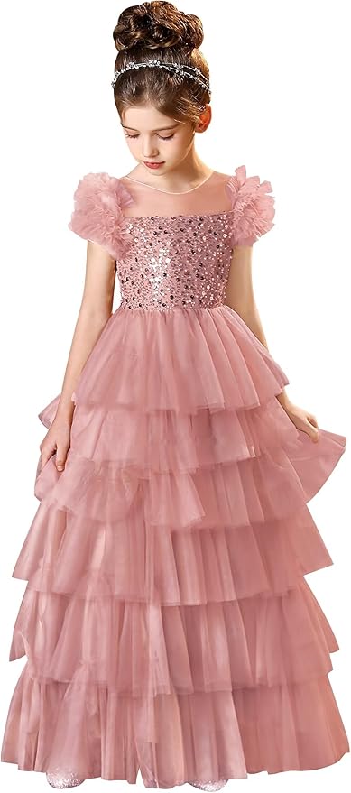 Sequin Flower Girl Dresses for Wedding Ruffles Sleeves Pageant Dresses for Girls Puffy Tulle Prom Gown for Girls