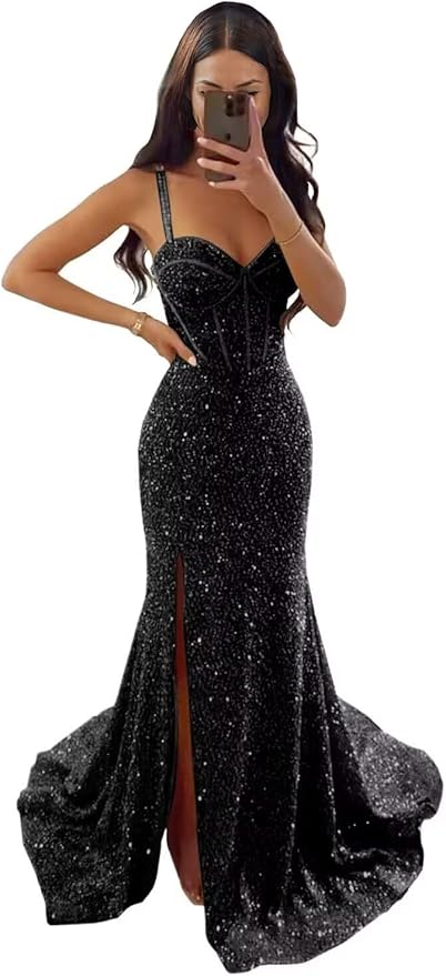 Prom Dresses Long for Women 2025 Mermaid Sparkly Sequin Slit Formal Dress Spaghetti Straps Corset Evening Party Gowns