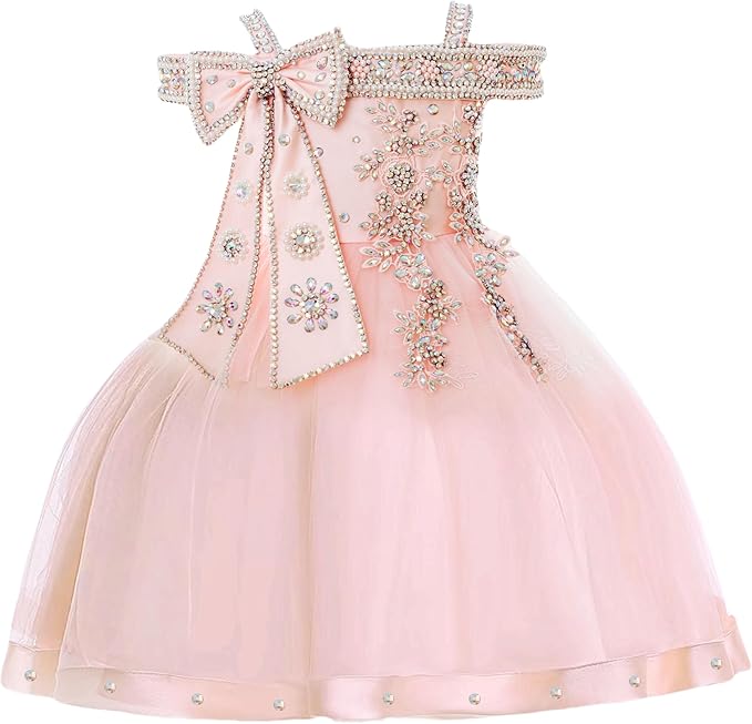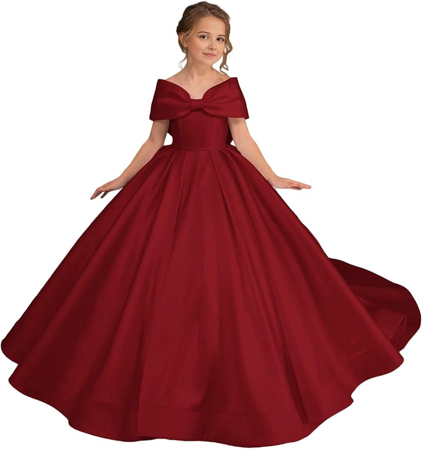 Satin Flower Girl Dress with Bow Off Shoulder First Communion Dress for Girls Pageant Dresses