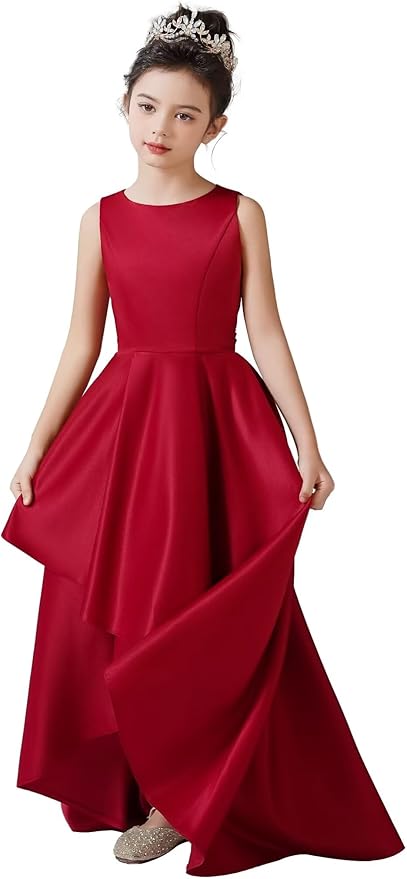 Satin Hi-Lo Formal Dress for Girls 4-16 Sleeveless A Line Quinceanera Dresses Flower Girl Dresses for Wedding