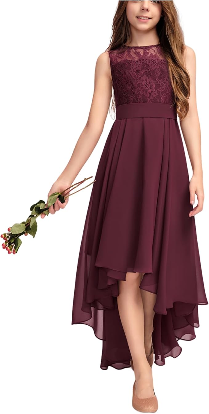 Junior Bridesmaid Dress for Teen Girls, Flower Girl Dresses Formal A-line Scoop Asymmetrical Chiffon Lace