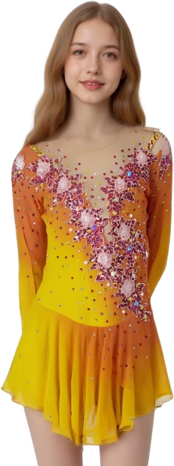 Figure Skating Dress Yellow Gradient and Embroidery Pattern Competition Performance