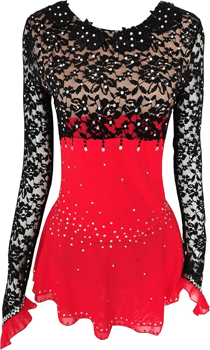 Ice Figure Skating Dress Girls Women Black and Red Lace Long Sleeve Competition Dress