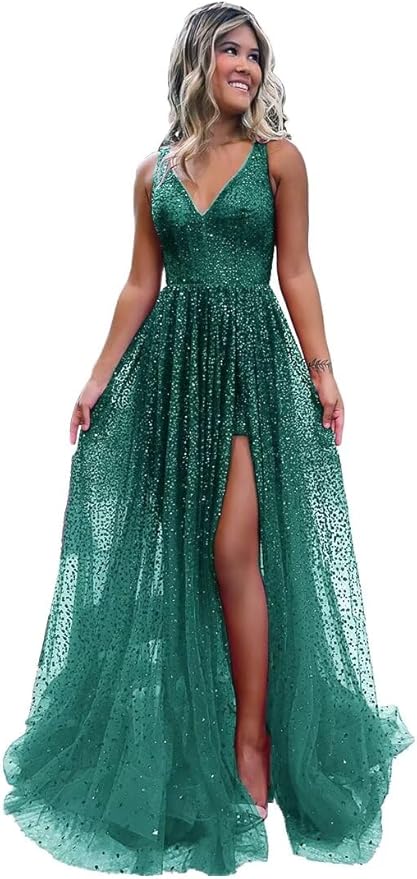 V-Neck Mermaid Prom Dresses 2023 with Slit Sparkly Sequin Tulle A-Line Formal Evening Party Gowns with Train