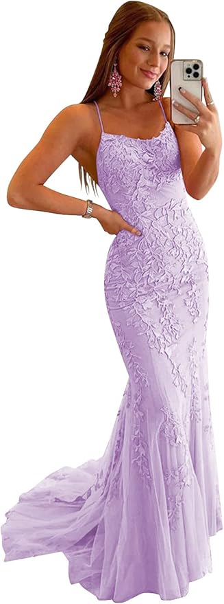 Women's Long Lace Prom Dresses Mermaid Spaghetti Straps Backless Formal Evening Gowns