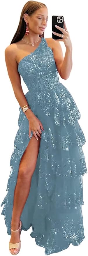 One Shoulder Sparkly Lace Tiered Tulle Prom Dresses Corset Long A Line Formal Evening Gown with Slit QA120