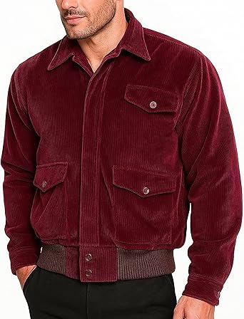 Men's Red Corduroy Jacket - Shirt Style Red Bomber Jacket - Corduroy Varsity Style Casual Outerwear Bomber