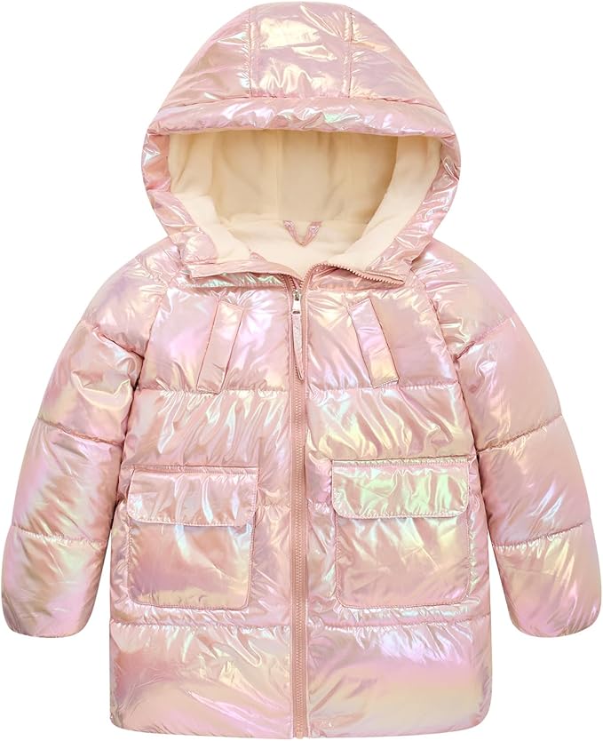 5-12 Years Girls Winter Long Fleece Coat Parka Metallic Puffer Jacket Outwear with Hooded