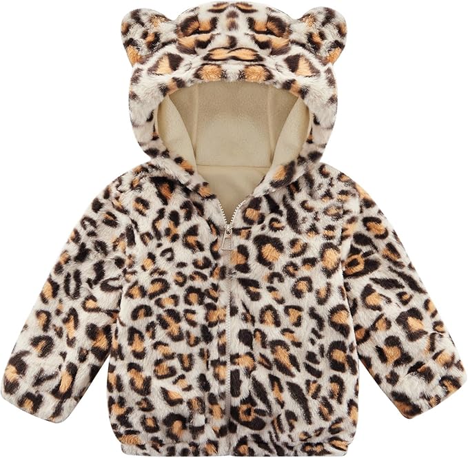 Toddler Girls Fleece Jacket Zip Up Leopard Bear Hoodies Warm Fall Winter Coat Kids Fuzzy Outerwear with Pockets