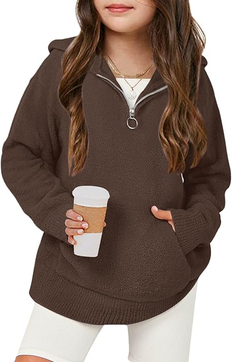 Girls Fuzzy Hoodies Kids Sherpa Quarter Zip Hooded Sweatshirts with Pocket 5-14 Years