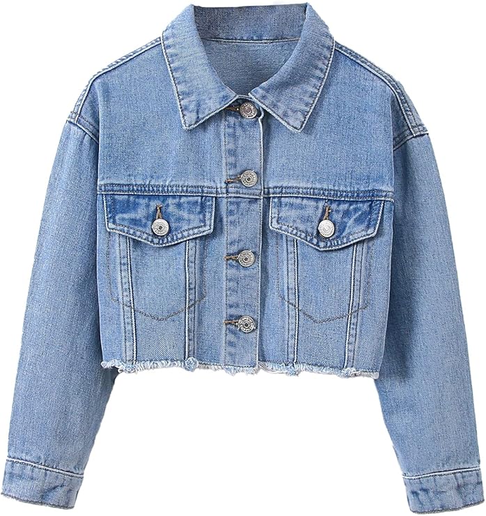 Girl's Raw Hem Long Sleeve Single Breasted Crop Denim Jacket Outerwear