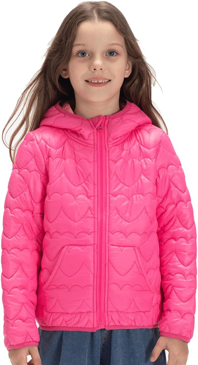 Lightweight Heart Quilted Cotton Puffer Jacket for Girls & Kids Zip Up Hooded Coat with Kangaroo Pocket