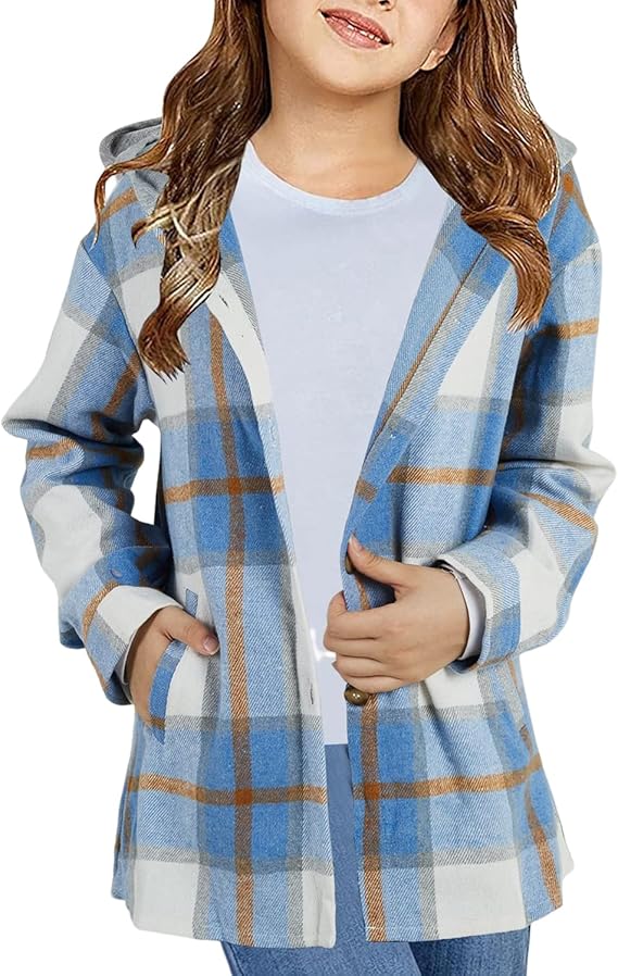 Girls Cute Flannel Plaid Button Down Top with Pockets Long Sleeve Hooded Jacket